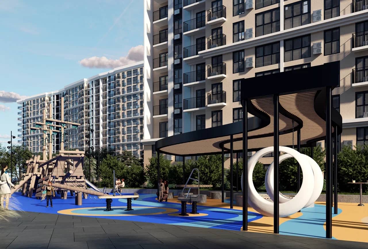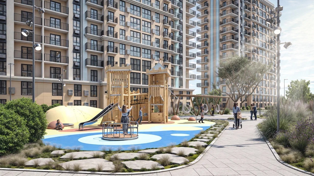 На территории внутреннего двора создана удобная инфраструктура с разнообразными зонами для всех: прогуляйтесь по зелёным аллеям с арками, устройте незабываемую вечеринку у бассейна или наслаждайтесь активным отдыхом с семьёй на свежем воздухе.